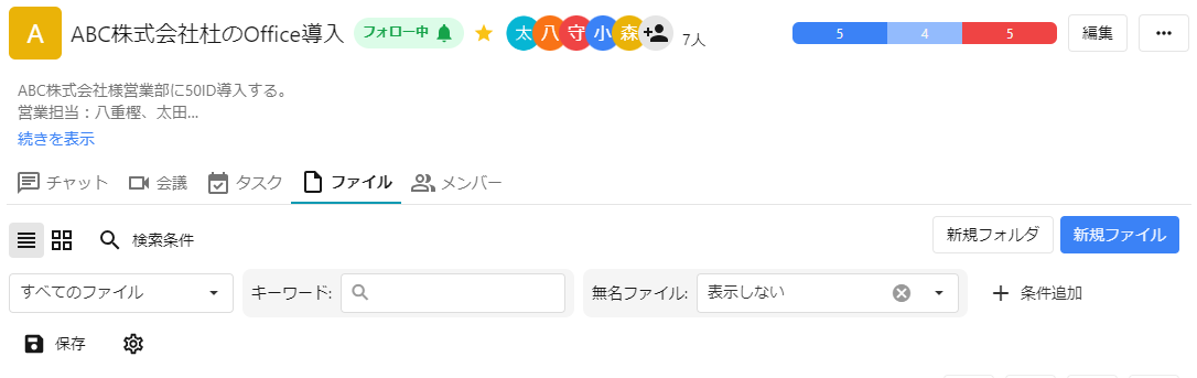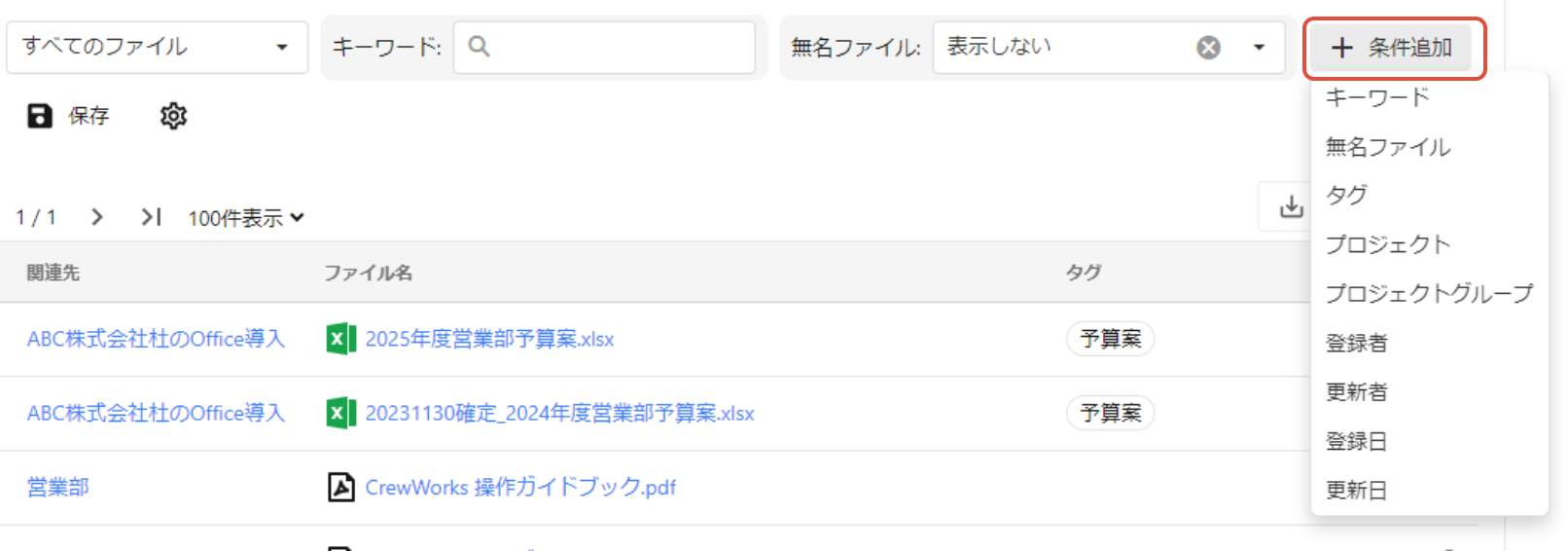 ・プロジェクト詳細画面で「ファイル」タブをクリック後、「検索条件」をクリックした状態