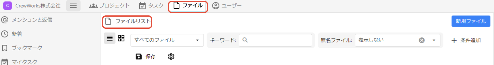 ・メインナビゲーションの「ファイル」をクリックして「ファイルリスト」が表示された状態