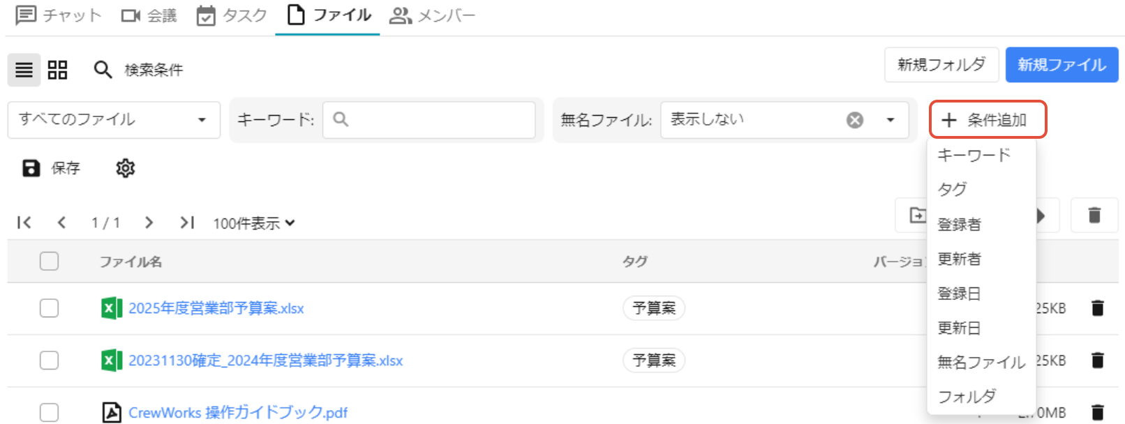 キーワードやタグ、登録者、登録日など、詳細な条件を指定して、ファイルを検索することができます。
