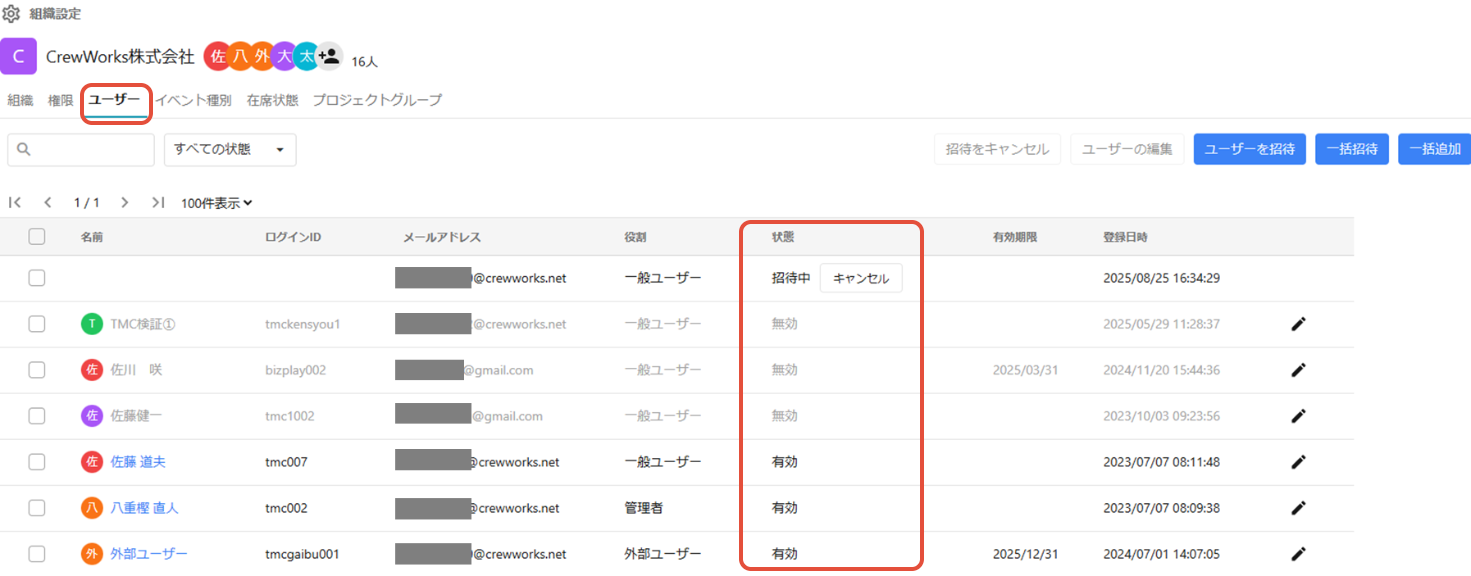 2. 招待したユーザーが招待メールを開き、アカウント登録を行うと、「状態」項目が「有効」と表示されます。招待後利用開始していないユーザーは「状態」項目が「招待中」と表示されます。