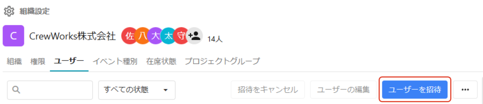 招待したユーザーがCrewWorksにログインすると、管理者の組織設定ユーザータブで、「状態」項目が「有効」と記載されます。