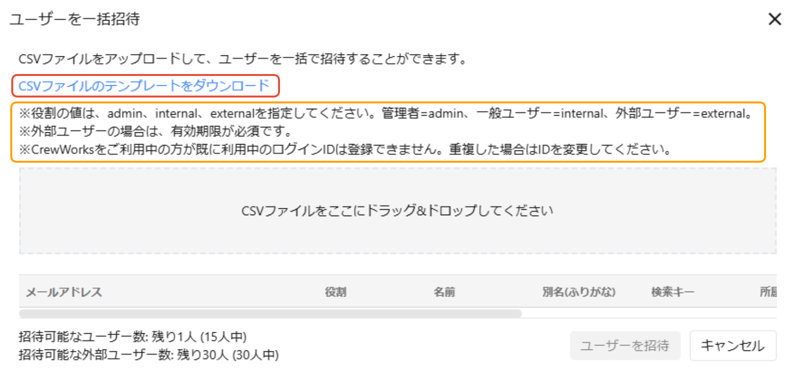 ② 「ユーザーを一括招待」画面が表示されます。「CSVテンプレートをダウンロード」をクリックし、ユーザー登録用のファイルをダウンロードします。