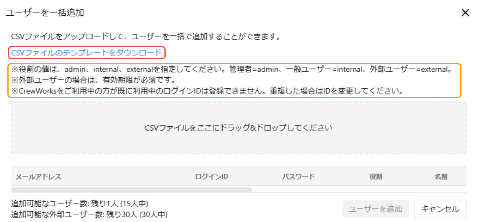 ② 「ユーザーを一括追加」画面が表示されます。「CSVテンプレートをダウンロード」をクリックし、ユーザー登録用のファイルをダウンロードします。