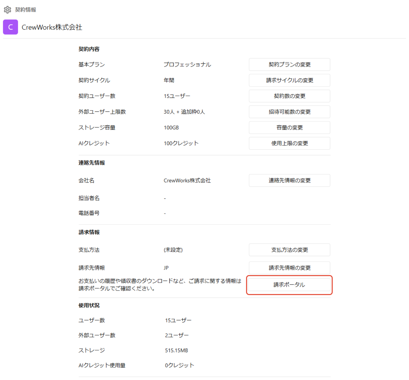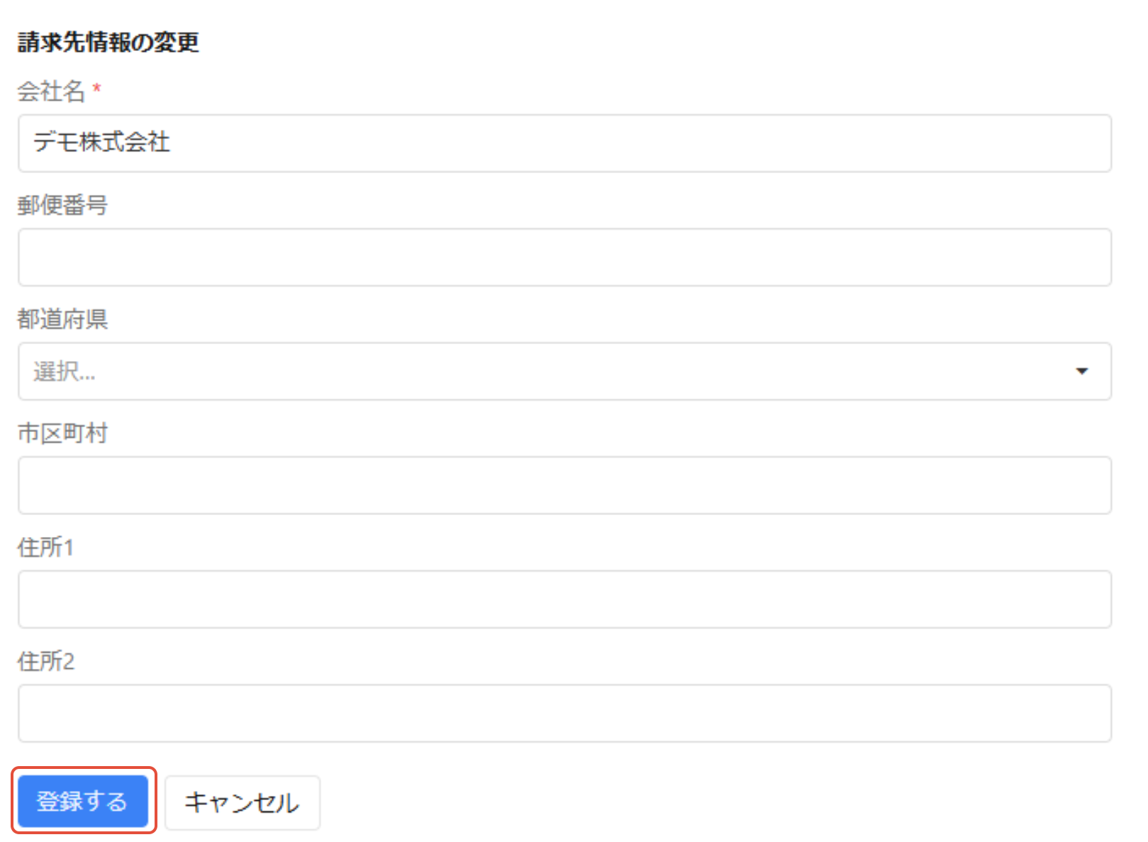 「契約情報」の「請求先情報の変更」ボタンより、請求先の会社名や住所を変更することができます。