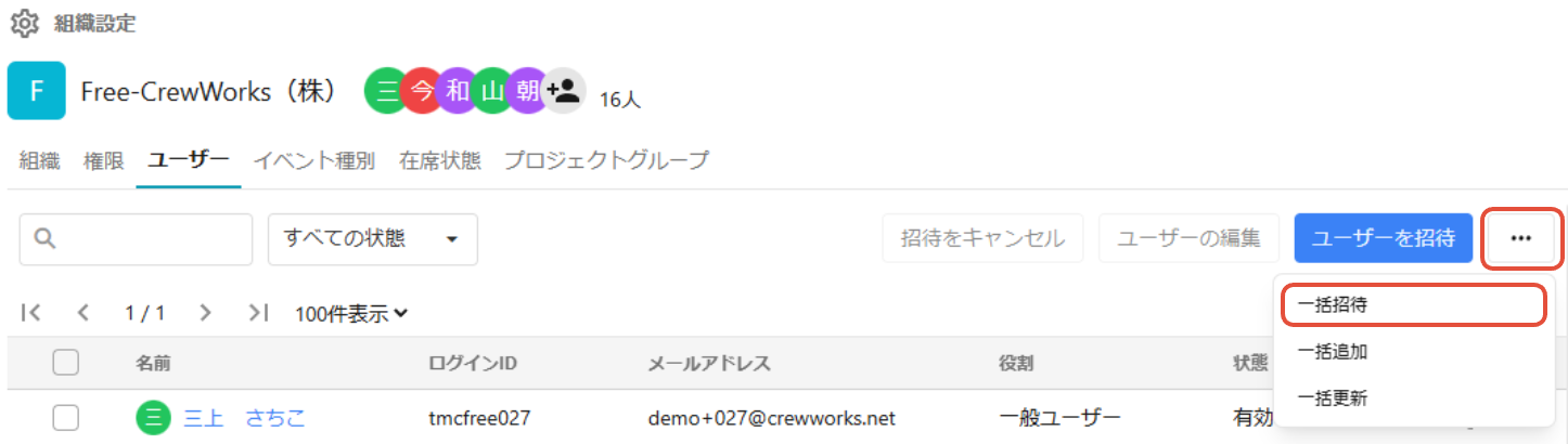ユーザーを1人ずつ招待する方法と、CSVファイルから一括招待する方法があります。