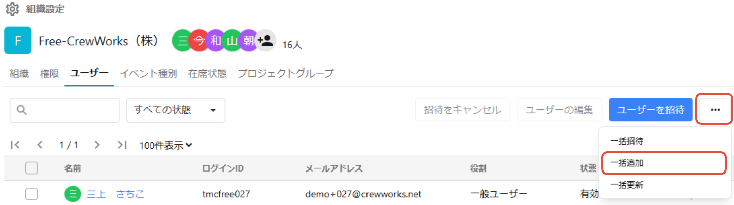 招待したユーザーがCrewWorksにログインすると、管理者の組織設定ユーザータブで、「状態」項目が「有効」と記載されます。