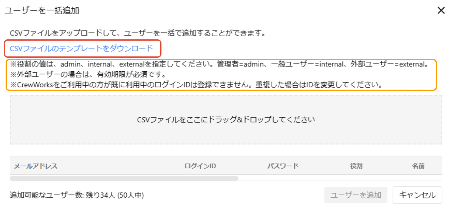 ② 「ユーザーを一括追加」画面が表示されます。「CSVテンプレートをダウンロード」をクリックし、ユーザー登録用のファイルをダウンロードします。