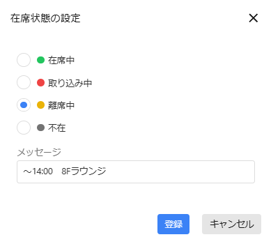 「在席中」「離席中」など現在の在席状態やメッセージを登録することができます。