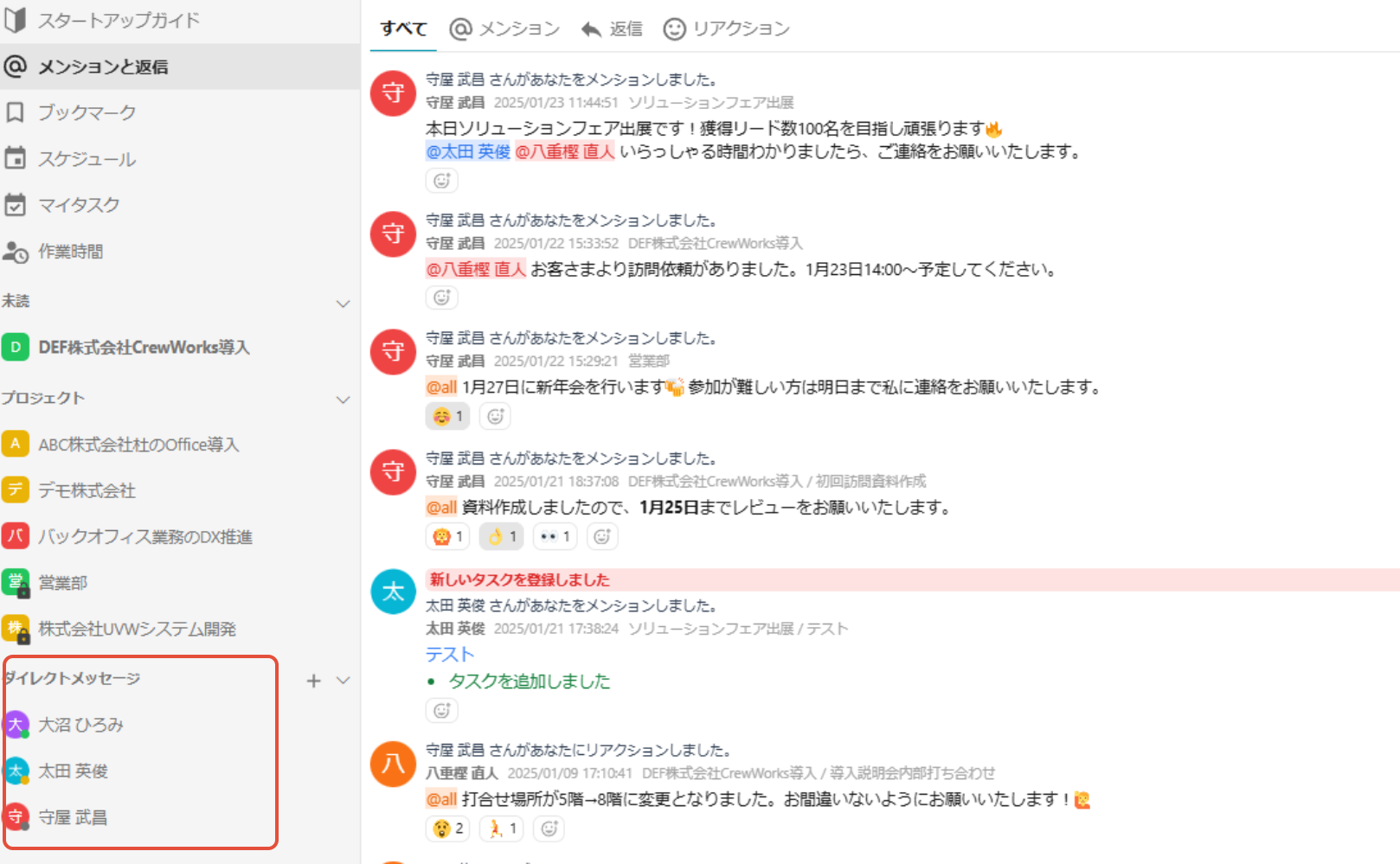 メンバーの在席状態は、プロジェクトの「メンバー」タブやサイドメニューの「ダイレクトメッセージ」にて一覧で確認することができます。