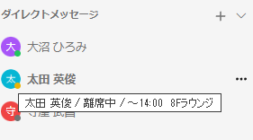 サイドメニューの「ダイレクトメッセージ」では、メンバーのアイコンにカーソルをあてると、名前・在席状態・メッセージが表示されます。