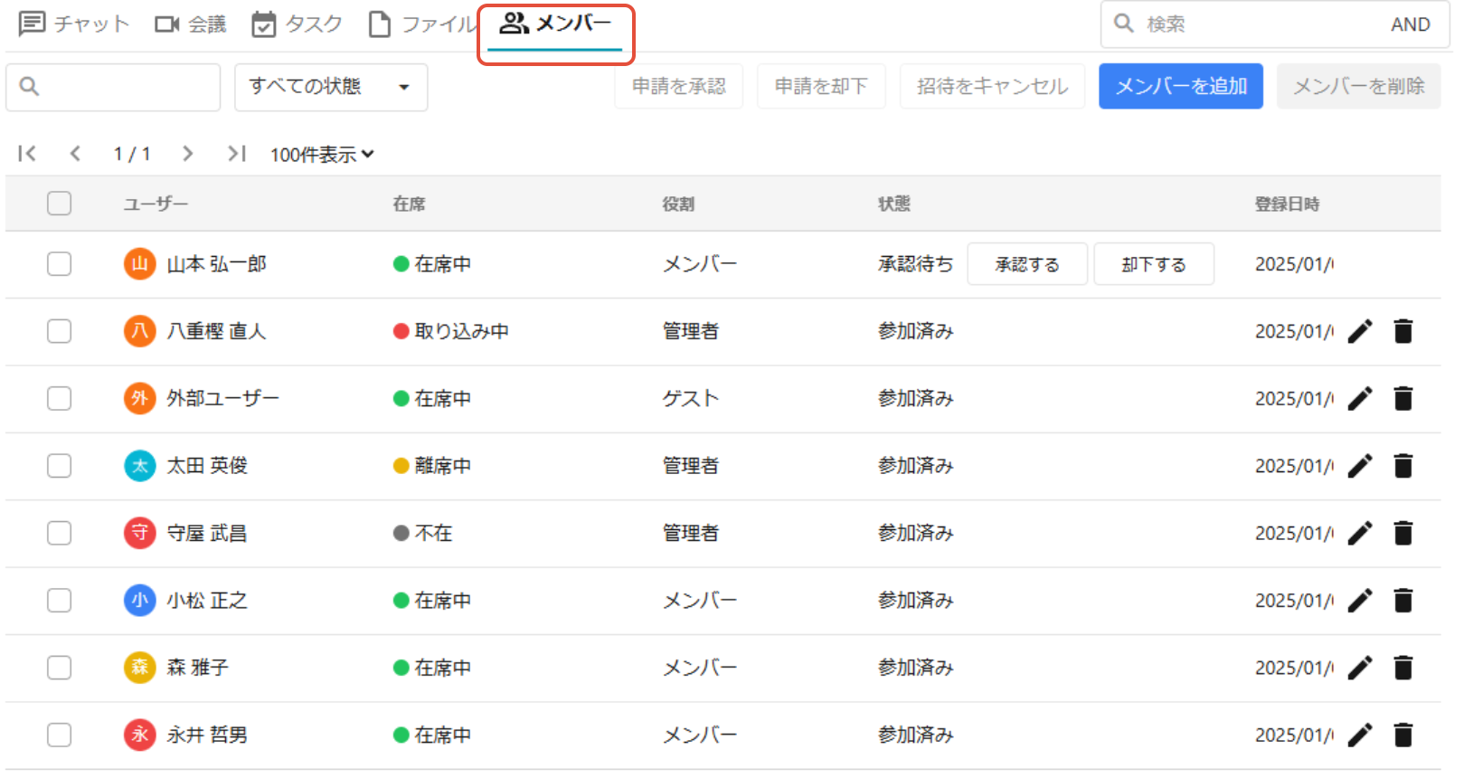 ※ メンバーの在席状態を変更することはできません。