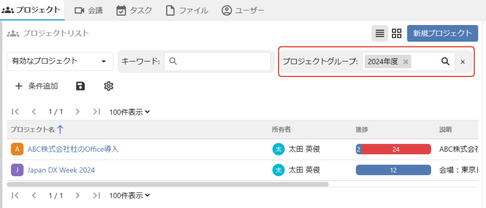プロジェクトグループを設定すると、プロジェクトリスト画面でプロジェクトグループで検索ができるようになります。