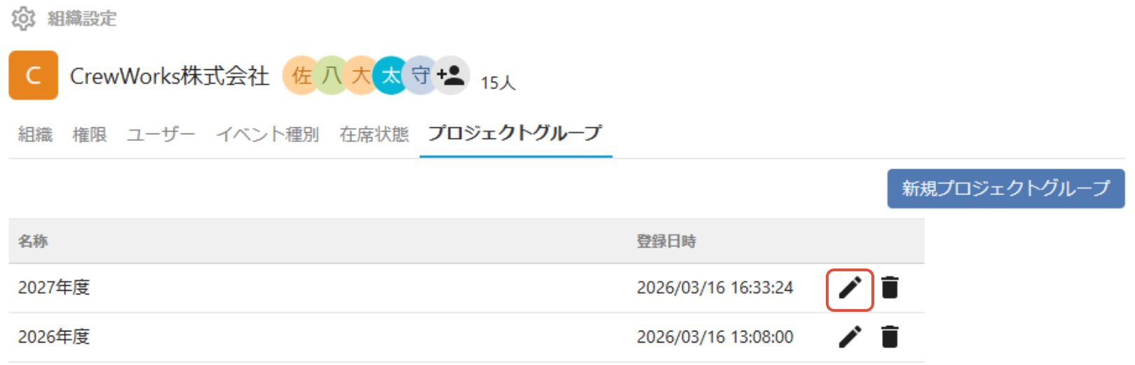 3. 編集したいプロジェクトグループの右のえんぴつボタンをクリックします。