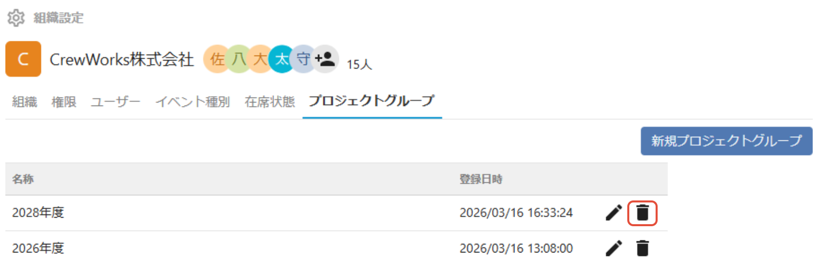 3. 削除したいプロジェクトグループの右のごみ箱ボタンをクリックします。