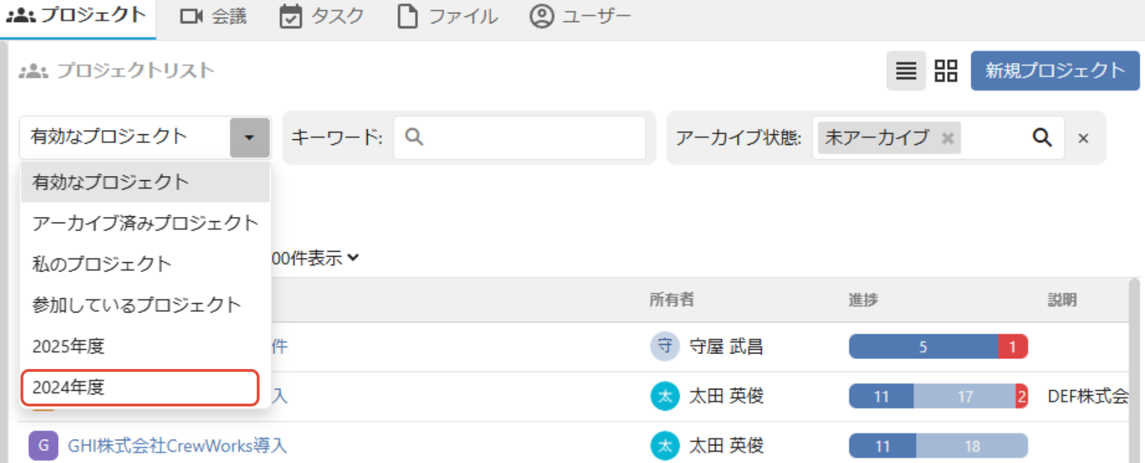 プロジェクトを検索する方法は、「プロジェクトを検索する」をご確認ください。