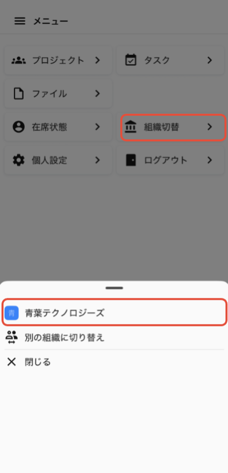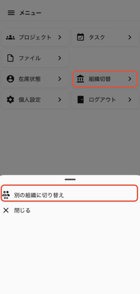 2. 「メニュー」画面の「組織切替」をタップします。続いて「別の組織に切り替え」をタップします。
