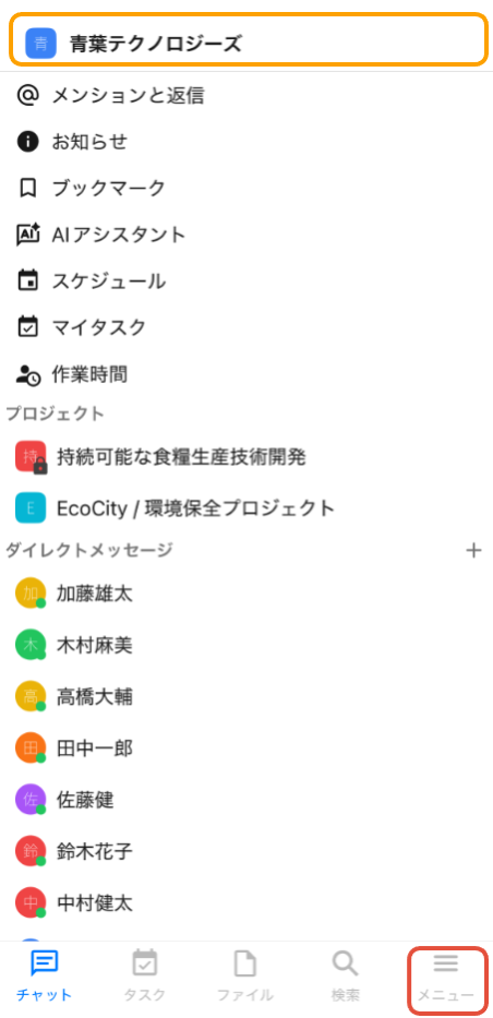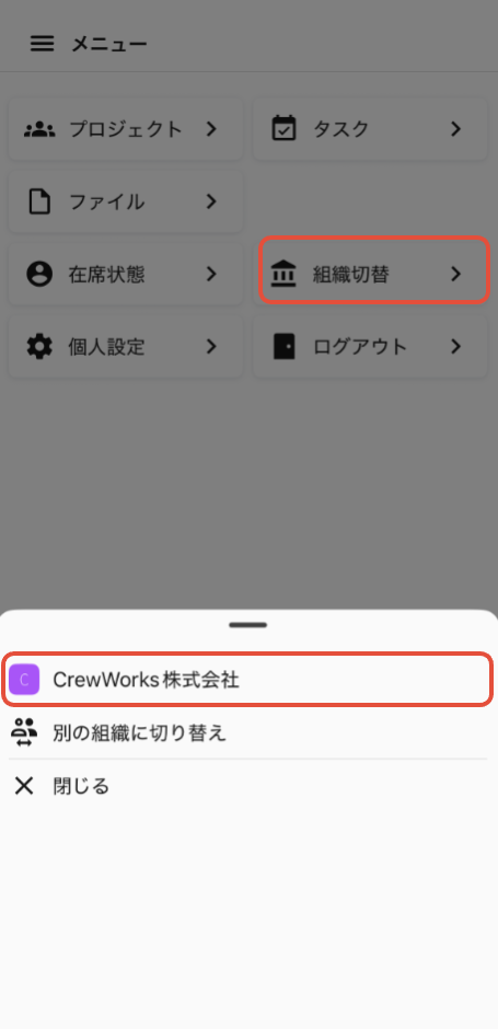 4. 次回からは「メニュー」→「組織切替」の順にタップすると、過去に同じIDでログインしたことのあるCrewWorksサイト名が表示されます。
