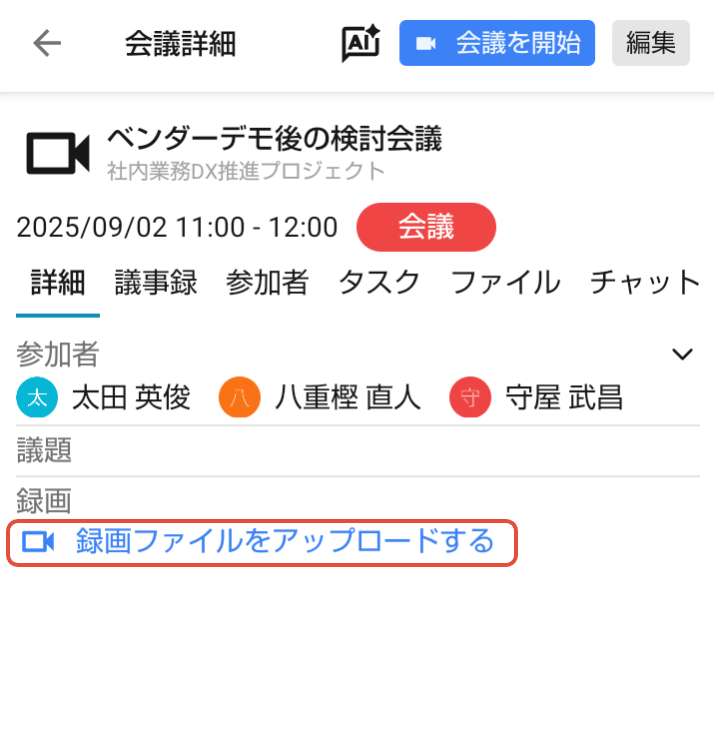 1. 会議詳細画面を開きます。「録画ファイルをアップロードする」をクリックし、会議の録画ファイル(mp4)を選択します。