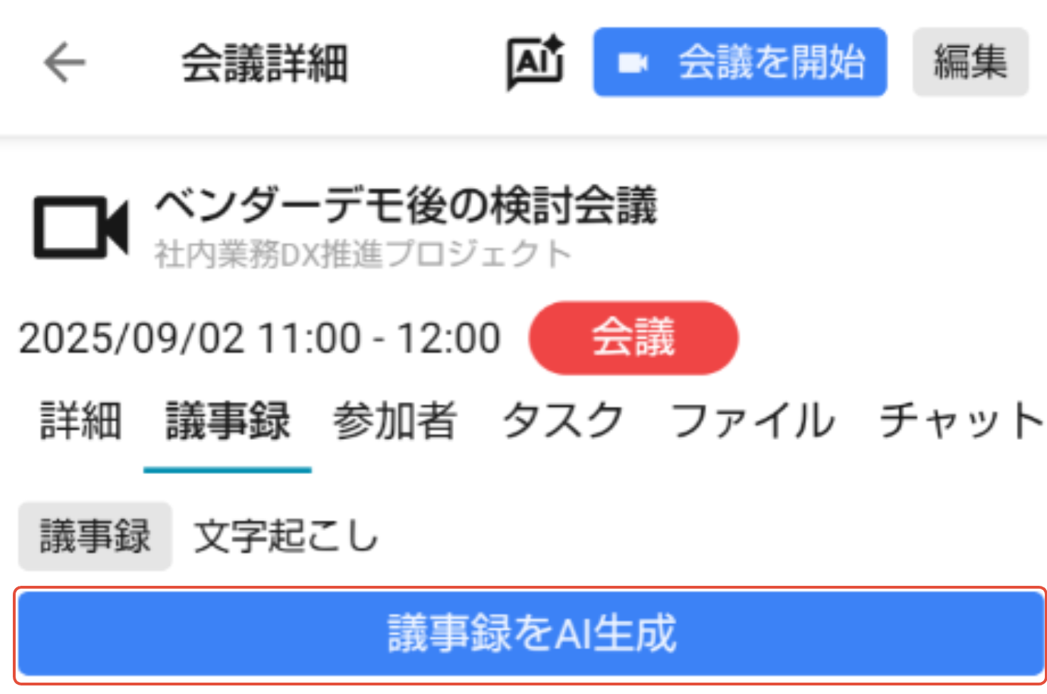 2. 「議事録」タブを開き、タブ上部の「議事録をAI生成」ボタンをクリックします。