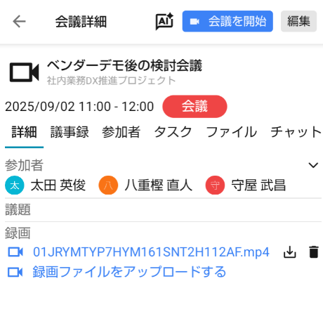 1. 会議詳細画面を開きます。録画ファイルがあることを確認します。