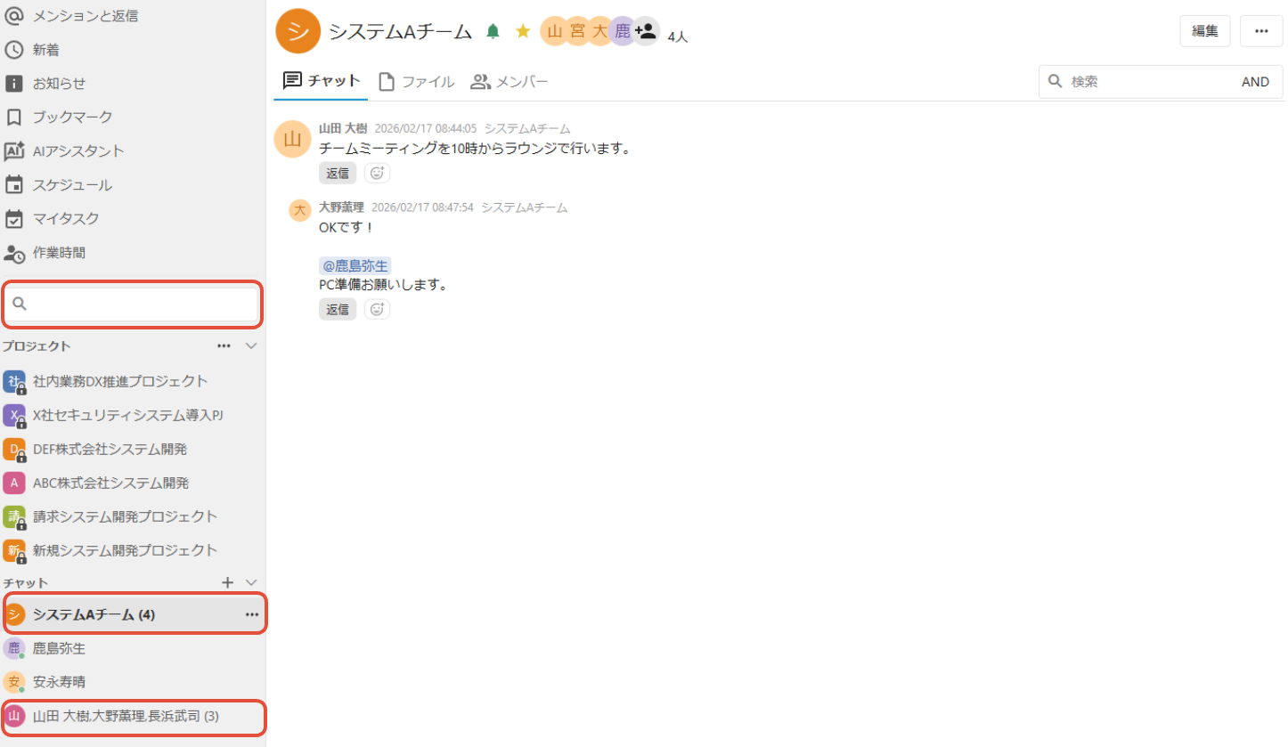 詳細は、「ダイレクトチャット・グループチャットを送信する」、「プロジェクト、チャットを検索する」をご確認ください。〈変 更〉
