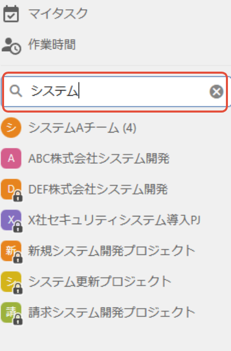 サイドメニューの「未読」プロジェクト、お気に入り登録したプロジェクト、「チャット」に登録されているユーザーを簡単に検索できます。