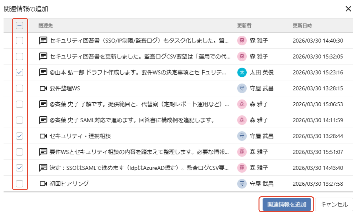 タスクに関連する情報を、AIエージェントがプロジェクト内を検索して提示します。提示された関連情報の中から必要なものを選択してタスクの「関連情報」タブに保持できます。