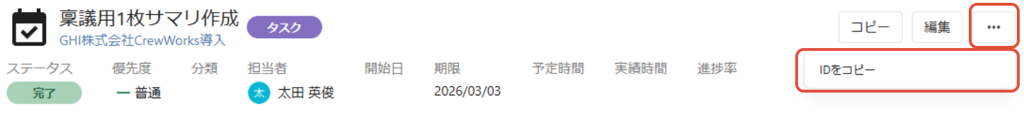 関連付けたいタスク、会議、ファイルの「IDをコピー」して、直接チャットに貼り付けることもできます。