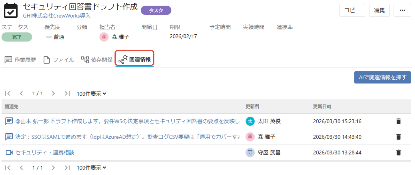タスクに関連する情報をAIが探して、必要な情報のみ関連情報として紐づけてリンクを管理することができます。