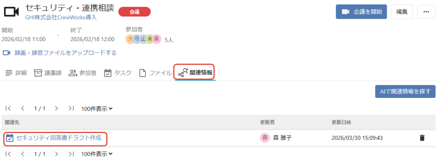 ※ 関連付けた先のタスクや会議の「関連情報」タブにもタスクが自動的に登録され、相互リンクとなります。