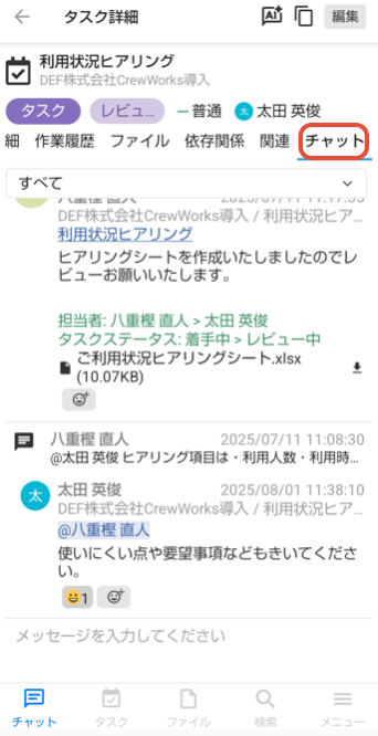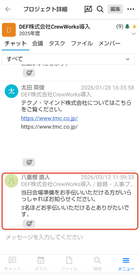 プロジェクト内でチャットメッセージをやり取りできます。会議、タスク、ファイルにもそれぞれ「チャット」タブが用意されており、どの画面でもチャットできます。