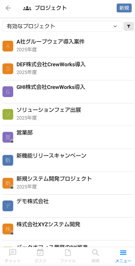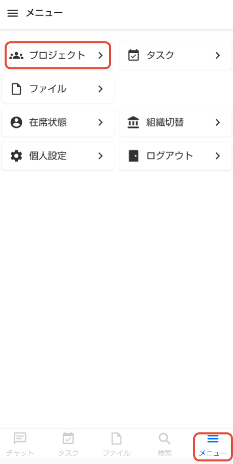 または、画面右下の「メニュー」ボタンをタップし、「プロジェクト」をタップして表示されるプロジェクト一覧から、チャットしたいプロジェクトを選択します。