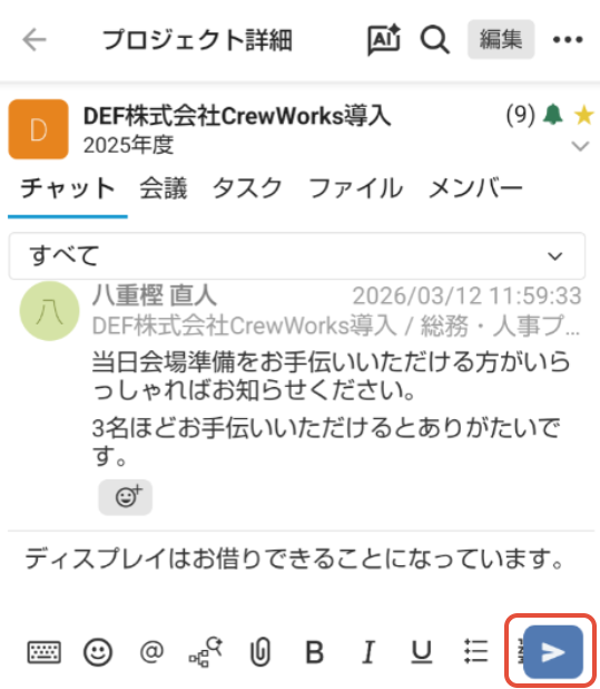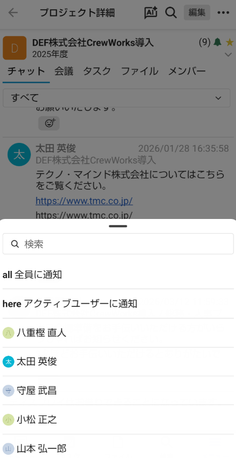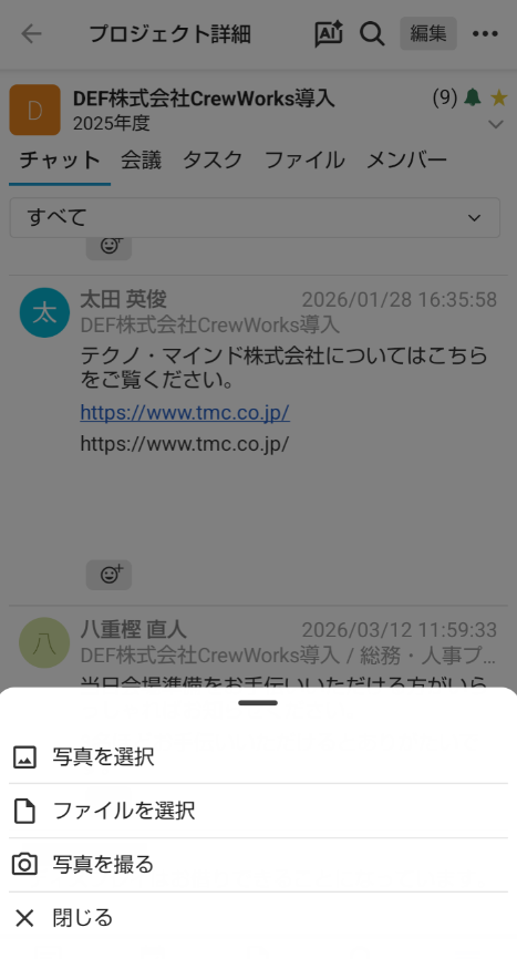画面左下の「チャット」ボタンをタップし、チャットしたいプロジェクトを選択します。