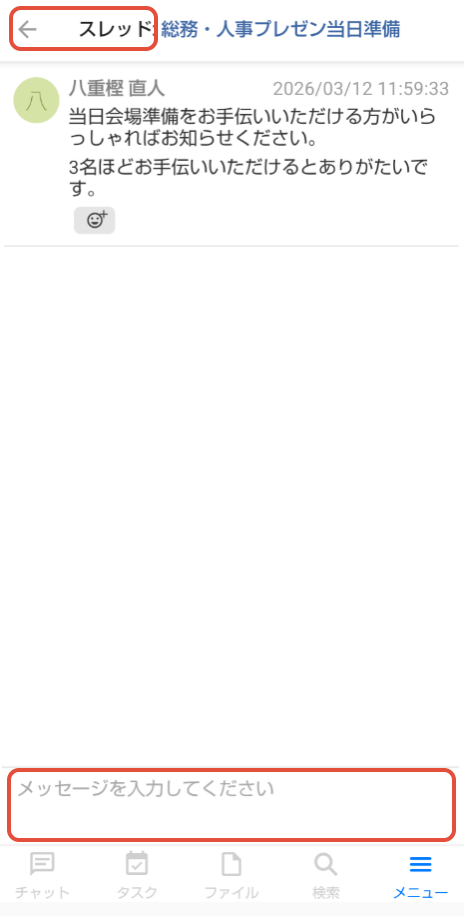 2. 画面上部に「スレッド」と表示され、元のメッセージが表示されます。この画面の下のメッセージ入力欄にメッセージを入力して送信します。