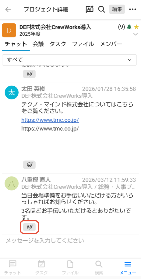 1. リアクションしたいメッセージ内の「リアクション」ボタンをタップします。