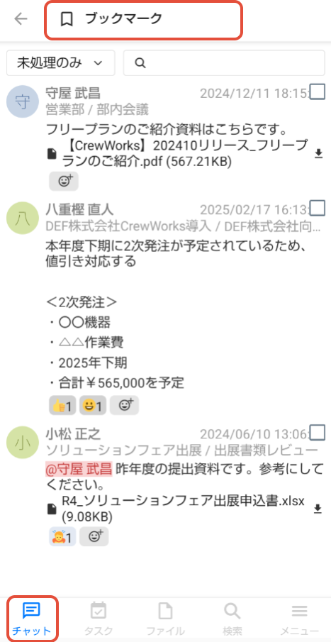 ブックマークしたメッセージは、画面左下の「チャット」ボタンをタップし、「ブックマーク」で確認できます。