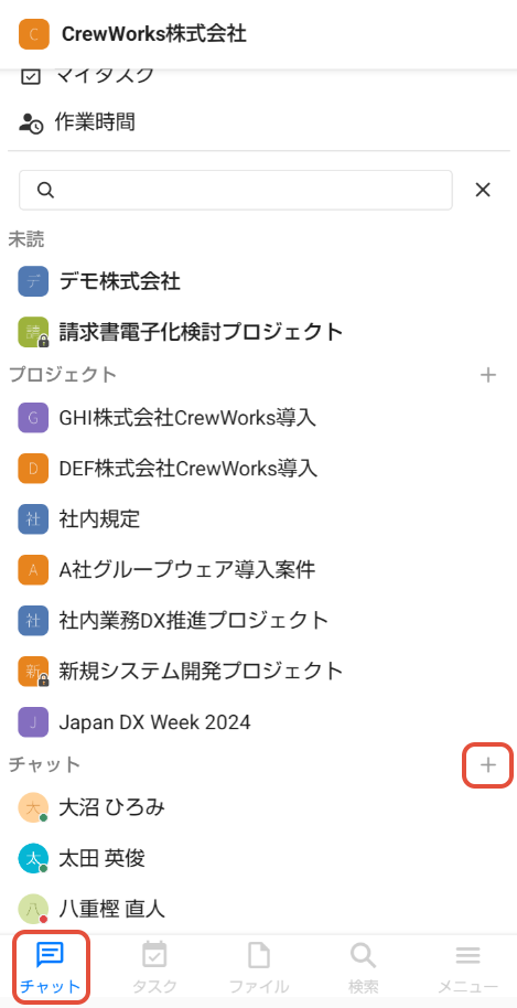 1. 画面左下の「チャット」タブをタップし、画面下の方にある「チャット」右の「+」をタップします。